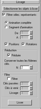 Par défaut, le lissage réduit le nombre de clés. En option, il peut également filtrer (calculer la moyenne) des clés d'animation existantes afin que les changements s'effectuent plus progressivement et que le mouvement semble plus naturel.