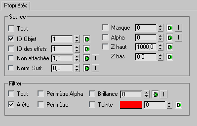 L'onglet Propriétés du module Lens Effects Highlight vous permet de déterminer les sections de votre scène auxquelles sont appliqués des reflets, ainsi que le mode d'application des reflets.
