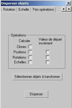 Lorsque vos clones sont générés, l'objet original et ses clones sont des objets de dispersion ; autrement dit, ils sont tous sélectionnés dans la liste de l'onglet Ttes opérations (Sélectionner objets à transformer), et ils seront donc tous soumis aux opérations spécifiées par la suite dans les onglets Position, Rotation et Echelle. Vous pouvez modifier cette sélection à partir du groupe de fonctions Ttes opérations