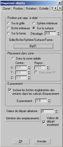 Contient des options permettant de positionner des objets à l’aide d’un objet de référence (répartition). Vous pouvez répartir les objets de manière aléatoire sur la surface d'une grille (ou autre objet), le long d'une forme ou dans le volume d'un parallélépipède (" boîte ") ou d'une sphère. Vous pouvez choisir uniquement une option dans les deux premières zones du groupe.