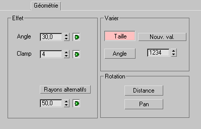 L'onglet Géométrie vous permet de définir la rotation initiale des reflets, ainsi que l'impact de la fonction sur les éléments sur une durée déterminée. L'onglet Géométrie comprend trois zones : Effet, Varier et Rotation.