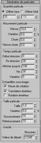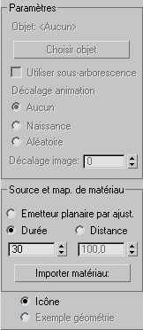 Cette section décrit la zone Afficher icône du panneau déroulant Paramètres de base, la zone Mouvement particule du panneau déroulant Génération de particules et la zone Source et mapping de matériau du panneau déroulant Type de particules. Ces commandes sont les seules qui soient propres à Blizzard. Les autres groupes de fonctions Blizzard sont identiques aux groupes de fonctions Réseau particules, à l'exception de Fragments objet et des paramètres connexes, qui ne sont pas disponibles dans le panneau déroulant Type de particules. Pour plus d'informations, reportez-vous à la rubrique Réseau P ou cliquez sur l'un des groupes de fonctions de la liste suivante.