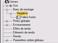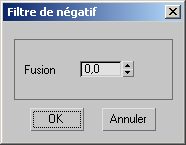 Lorsque vous cliquez sur le bouton Configuration dans la boîte de dialogue Ajouter événement filtre pour le filtre de négatif, la boîte de dialogue Banc de montage est remplacée par la boîte de dialogue non modale Filtre de négatif avec un champ Fusionner. Vous pouvez activer le bouton Clé auto, déplacer la glissière temps et modifier la valeur du champ Fusionner pour créer des clés. Vous pouvez également utiliser d'autres fonctions de 3ds Max ; vous pouvez, par exemple, créer des objets. Lorsque vous avez défini toutes les clés de votre choix, cliquez sur le bouton OK pour revenir au banc de montage.