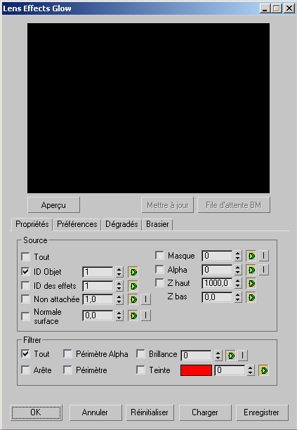 La boîte de dialogue Effet Lens Effect Glow (Luisance) comporte quatre onglets : Propriétés, Préférences, Dégradés et Brasier.