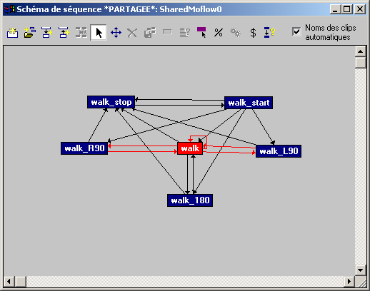 Ce réseau de séquences illustre un exemple sommaire de mouvements possibles : en effet, les personnages peuvent seulement démarrer, s'arrêter, tourner selon un angle de 90 degrés vers la gauche ou vers la droite (walk_L90 et walk_R90) et faire demi-tour (walk_180). Toutefois, pour obtenir des mouvements de foule plus naturels, il est conseillé d'enrichir le réseau de séquences avec des variations plus brèves et plus fines, telles que tourner par incréments de 45 degrés, se déplacer dans différentes directions en continuant à fixer un même point, se déplacer avec une vitesse variable, flâner, etc. Vous trouverez dans la bibliothèque de mouvements de Bipède une liste complète de clips avec lesquels vous pourrez faire des essais.