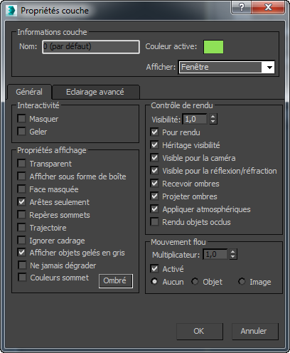 La boîte de dialogue Propriétés couche est identique à la boîte de dialogue Propriétés objets. Vous pouvez y modifier les paramètres de rendu, mouvement flou et affichage d'une ou plusieurs couches sélectionnées. De plus, vous pouvez également modifier les paramètres d'éclairage avancé d'une ou plusieurs couches sélectionnées, ou masquer/geler celles-ci.