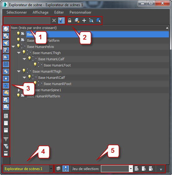 Lorsque cette option est activée, la barre d'outils est positionnée verticalement sur le côté gauche de la fenêtre de l'explorateur de scènes. Ses boutons vous permettent de choisir le type d'objets apparaissant dans la liste de l'explorateur de scènes. Lorsqu'un bouton de filtre est activé (fond mis en surbrillance), le type d'objet correspondant s'affiche dans la liste ; lorsqu'il est désactivé (fond gris), l'explorateur de scènes ne répertorie pas le type d'objet correspondant.