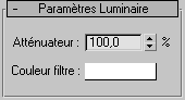 Lorsque vous fermez un assemblage sélectionné, le groupe de fonctions Modifier affiche les paramètres Luminaire. En revanche, lorsque vous ouvrez un assemblage, 3ds Max affiche les paramètres de l'objet sélectionné. L'objet Luminaire propose les paramètres Atténuateur et Couleur filtre. Vous les mettez en relation avec les objets lumineux qui appartiennent à l'assemblage.