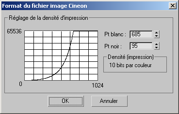 Lorsque vous choisissez CIN comme format de sortie, l'activation du bouton Rendu ou Configuration dans la boîte de dialogue Fichier sortie rendu permet d'accéder à la boîte de dialogue Format du fichier image Cineon.