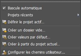 Pour définir le dossier du projet, choisissez l'une des options du sous-menu Projet ou cliquez sur le bouton approprié dans la barre d'outils Projets.