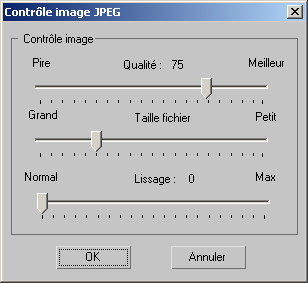 Lorsque vous choisissez JPEG comme format de sortie, l'activation du bouton Rendu ou Configuration dans la boîte de dialogue Fichier sortie rendu permet d'accéder à la boîte de dialogue Contrôle image JPEG.