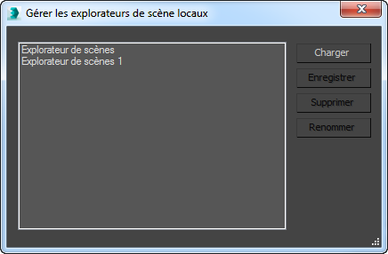 Lorsque vous créez un explorateur de scènes local, il reste disponible pour les prochaines utilisations de la scène tant qu'elle durera, même si vous la fermez. Utilisez la boîte de dialogue Gérer les explorateurs locaux pour ouvrir, enregistrer et charger des explorateurs de scènes locaux personnalisés, ou pour supprimer et renommer des instances existantes.