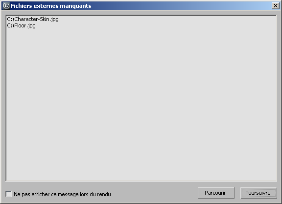 - S'affiche uniquement lors du rendu. Lorsque cette option est activée, 3ds Max n'affichera pas la boîte de dialogue la prochaine fois que des fichiers externes seront introuvables.