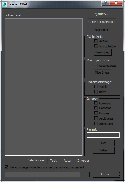 La boîte de dialogue Scènes Xréf vous permet d'ajouter et de supprimer des scènes avec références externes. Elle vous fournit aussi des outils pour le contrôle de l'affichage de la scène avec références externes, des options permettant d'ignorer des composants de la scène et la possibilité d'être lié à un objet parent pour que vous puissiez mettre à l'échelle, faire pivoter ou déplacer la scène avec références externes.