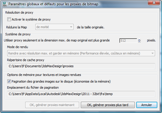 Cette boîte de dialogue vous permet de déterminer comment 3ds Max crée et utilise les versions ou les bitmaps de proxy incorporés dans les matériaux. Vous pouvez également activer ou désactiver la pagination bitmap.