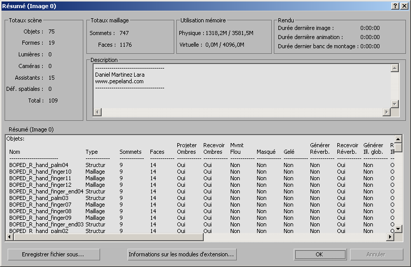 La commande Résumé affiche les statistiques relatives à la scène courante.