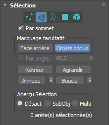 Dans le panneau déroulant Sélection, des outils permettent d'accéder à différents niveaux de sous-objet et paramètres d'affichage, et de créer et modifier des sélections ; ils affichent également des informations sur les entités sélectionnées.