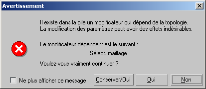 De nombreux autres types de modificateurs, exécutent cependant des opérations sur la topologie explicite de sélections de sous-objets. C'est le cas, par exemple, des modificateurs d'Edition et de Sélection. Lorsqu'un modificateur dépendant de la topologie est présent dans la pile, vous risquez d'affecter ses résultats si vous consultez les opérations de pile précédentes et que vous modifiez le nombre ou l'ordre des sous-objets (tels que les faces ou les sommets) de la sélection. Si vous essayez de procéder ainsi, un avertissement vous informe de la situation: