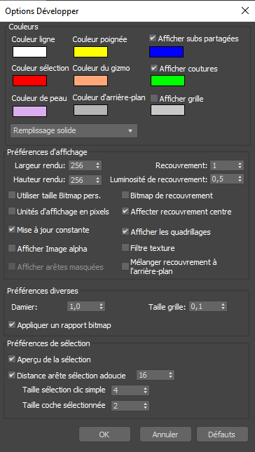 Définissez les préférences de l'éditeur du modificateur Dével. UVW à l'aide des commandes de la boîte de dialogue Options Développer.