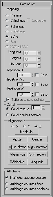 Définit le canal de texture. le modificateur Texture UVW utilise par défaut le canal 1. Ainsi, le mapping adopte le comportement par défaut, sauf si vous sélectionnez explicitement un autre canal. Valeur par défaut=1. Intervalle = de 1 à 99.