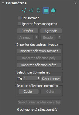 Ce panneau déroulant fournit des boutons permettant d'activer et de désactiver différents modes sous-objet, ainsi que de travailler avec des sélections et poignées nommées, des paramètres d'affichage et des informations concernant les entités sélectionnées.
