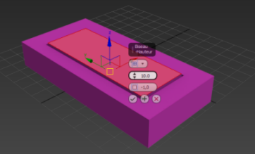 - Accédez au niveau de sous-objet Polygone, sélectionnez le polygone intérieur sur le haut de la boîte et extrudez-le vers l'intérieur de 10 unités. Quittez le mode Extruder.