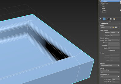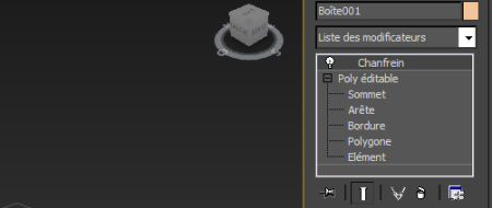 Remarque : 3ds Max propose plusieurs méthodes permettant d'obtenir le même résultat, mais celle-ci est recommandée pour examiner les options du modificateur Chanfrein.