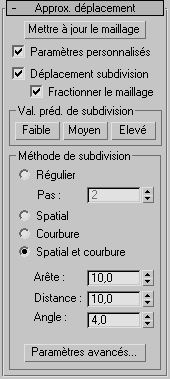 Dans le modificateur Dépl. maillage, le panneau déroulant permet de choisir les paramètres d'approximation de surface qui serviront à créer le maillage.