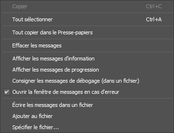 Cliquez avec le bouton droit sur la fenêtre de message de rendu pour afficher un menu contextuel contenant des options dédiées à l'affichage et à la gestion de ces messages.