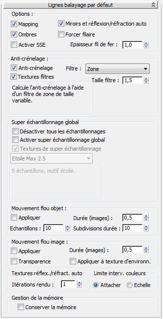 Ce panneau déroulant permet de définir les paramètres du rendu lignes de balayage par défaut.
