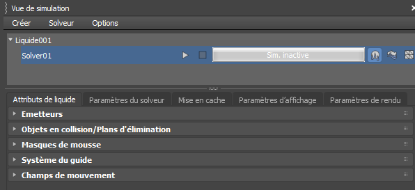 - Ce groupe de fonctions permet d'ajuster les différents paramètres du solveur et d'afficher les objets de la scène associés à la simulation :