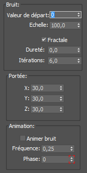 - Dans la zone Bruit, activez Fractale et dans la zone Portée, affectez la valeur 30,0 aux axes X, Y et Z.