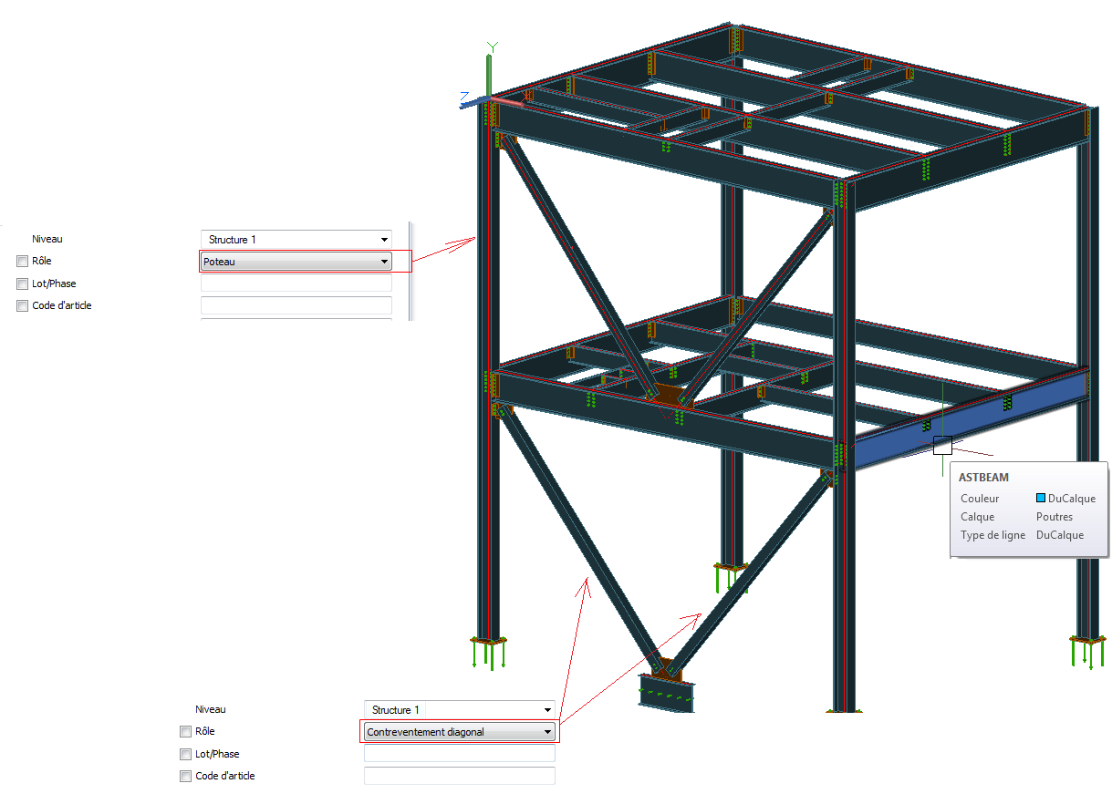 Dans la mesure où le préfixe est différent entre des objets identiques (poutres en acier et tôles), un niveau supplémentaire de filtrage est nécessaire dans les objets pour permettre à Advance Steel de faire la distinction entre un poteau en acier et une poutre d'angle en acier (utilisés comme cornières). Utilisez le rôle du modèle (une propriété d'objet qui définit le rôle de chaque objet dans le modèle) quelles que soient ses caractéristiques géométriques :