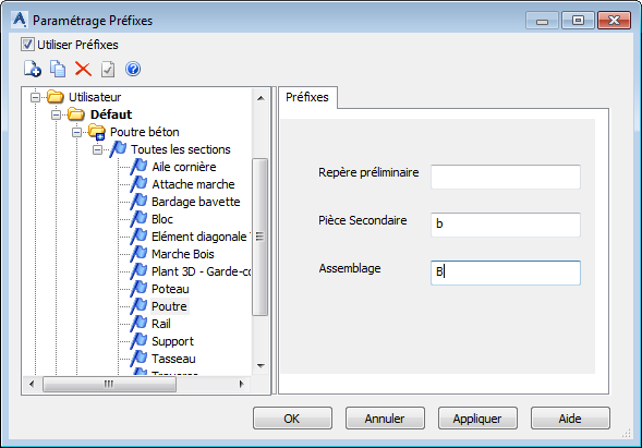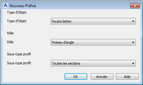 - Le rôle de modèle : le rôle de modèle est générique (le même rôle de modèle peut être attribué aux poutres et aux tôles). Dans la règle de préfixe, une combinaison des deux est sélectionnée (type d'objet + rôle de modèle).