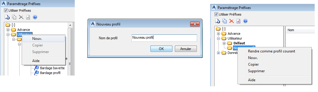 - Si vous disposez de différentes règles de préfixe, qui peuvent changer en fonction de la valeur par défaut, la boîte de dialogue Paramétrage Préfixes offre la possibilité de créer plusieurs profils. Une seule option peut être active à la fois.