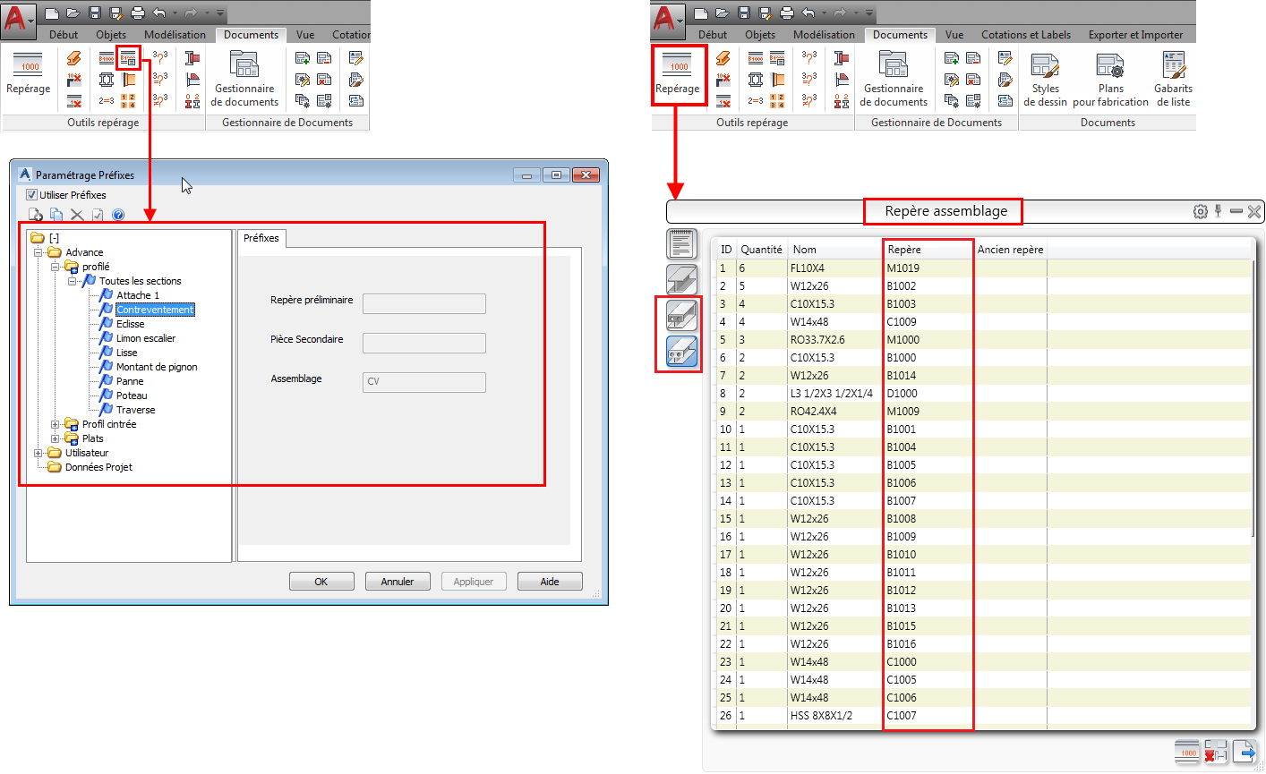 Les préfixes automatiques des pièces uniques et numérotations d'ensembles peuvent être configurés en fonction du rôle du modèle.