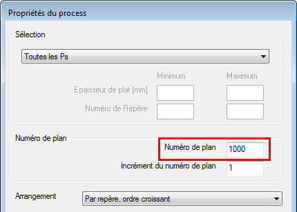 - Dans la boîte de dialogue Propriétés du process, utilisez le champ Numéro de plan pour définir le numéro du plan en fonction de vos besoins. Ce numéro deviendra le numéro de pièce. Dans cet exemple, le numéro de plan défini est 1 000 :
