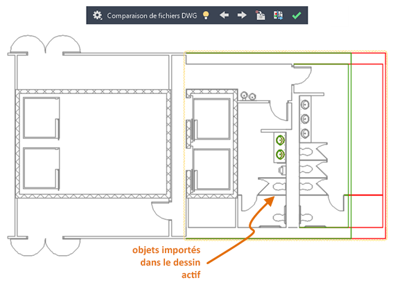 Vous pouvez importer les différences mises en évidence (en rouge) du dessin comparé vers le dessin courant. Si vous procédez ainsi, ces objets existeront dans les deux dessins et seront automatiquement grisés. Seuls les objets qui ne sont pas dans le dessin en cours peuvent être importés.