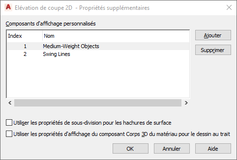 - Si vous avez désactivé l'option Utiliser les propriétés de sous-division pour les hachures de surface, l'affichage est désormais contrôlé par la propriété Par matériau du composant de dessin au trait de hachures de surface. Pour modifier ce paramètre, cliquez sur la valeur (*AUCUN*) du champ Composant d'affichage, sélectionnez le composant Dessin au trait de hachures de surface, puis modifiez la valeur de Par matériau.