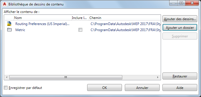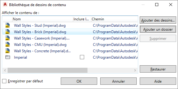 Lorsque vous ajoutez un fichier de dessin ou un dossier de fichiers de dessin à la bibliothèque de dessins de contenu, les styles ou les définitions de système sont disponibles pour être utilisés dans le dessin en cours.