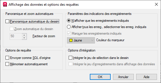 Pour obtenir la description de toutes les options disponibles, voir la section Boîte de dialogue Affichage des données et options des requêtes sous CONNECTBD dans la section Présentation des commandes.