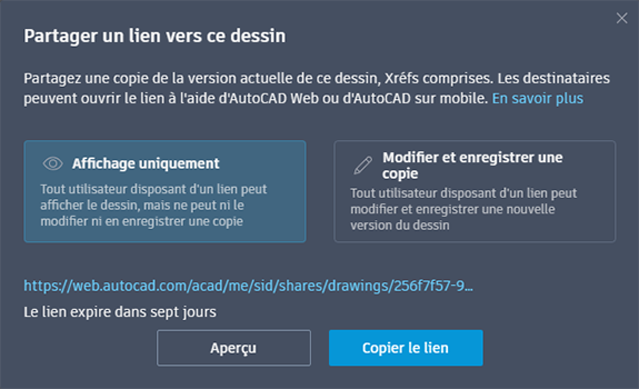 Tous les utilisateurs disposant du lien peuvent accéder au dessin dans un navigateur Web ou dans l’application mobile. Le lien expire sept jours après sa création. Vous pouvez choisir entre deux niveaux d’autorisation pour les destinataires : Affichage uniquement et Modifier et enregistrer une copie.