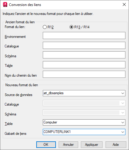 Indique le format du lien que vous convertissez. Des champs différents s'affichent, selon que vous sélectionnez R12 ou R13/R14.