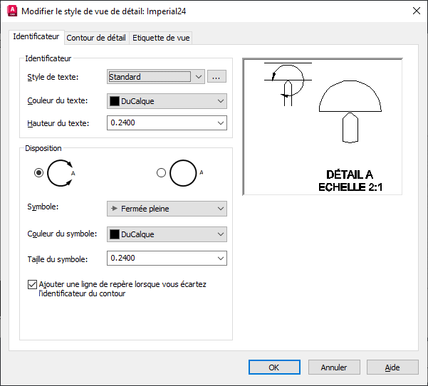Lorsque cette option est sélectionnée, le contour de détail est connecté à l'identificateur à l'aide d'une ligne de repère, lorsque l'identificateur est écarté de sa position par défaut.