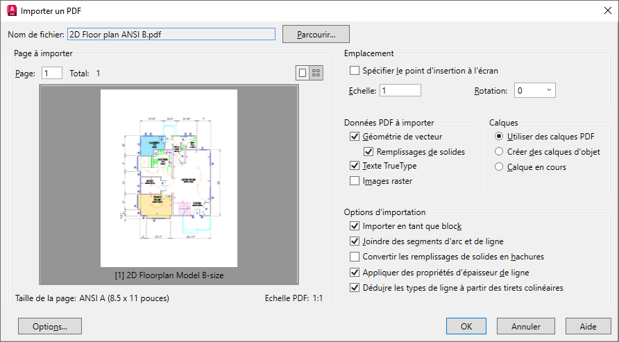 Crée des calques AutoCAD pour tous les types d'objets généraux suivants, importés depuis le fichier PDF : PDF_Geometry, PDF_Solid Fills, PDF_Images et PDF_Text.