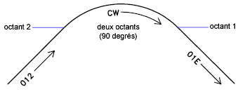 Celui-ci est appelé octant, car il englobe un ou plusieurs octants de 45 degrés, en commençant et finissant sur un contour d'octant. Les octants sont numérotés de façon trigonométrique à partir de la position "3 heures", comme l'illustre la figure suivante : ![]() La spécification de l'arc est 10,radius,(-)0SC Le rayon peut être toute valeur comprise entre 1 et 255. Le second octet de définition indique la direction de l'arc (trigonométrique s'il est positif et horaire s'il est négatif), son octant de départ ( s , une valeur comprise entre 0 et 7) et le nombre d'octants qu'il englobe ( c , une valeur comprise entre 0 et 7, 0 représentant huit octants, soit un cercle complet). Vous pouvez utiliser des parenthèses pour améliorer la lisibilité. Par exemple, examinez le fragment de définition de forme suivant : ...012,10,(1,-032),01E,... Ce code dessine un vecteur d'une unité vers le haut et vers la droite, un arc horaire à partir de l'octant 3 (avec un rayon d'une unité pour deux octants), puis un vecteur d'une unité vers le bas et vers la droite, comme l'illustre la figure suivante : ![]() |
