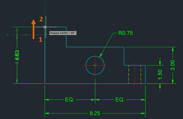 Remarque : Si vous souhaitez contraindre la direction lors de l'étirement, vous pouvez maintenir la touche Maj enfoncée pour activer temporairement le mode Ortho ou essayer de combiner des accrochages aux objets (le cas échéant) avec le repérage orthogonal (F8) ou polaire (F10) et le repérage par accrochage aux objets (F11). Pour en savoir plus sur ces rubriques, consultez les liens fournis à la fin de cet article.