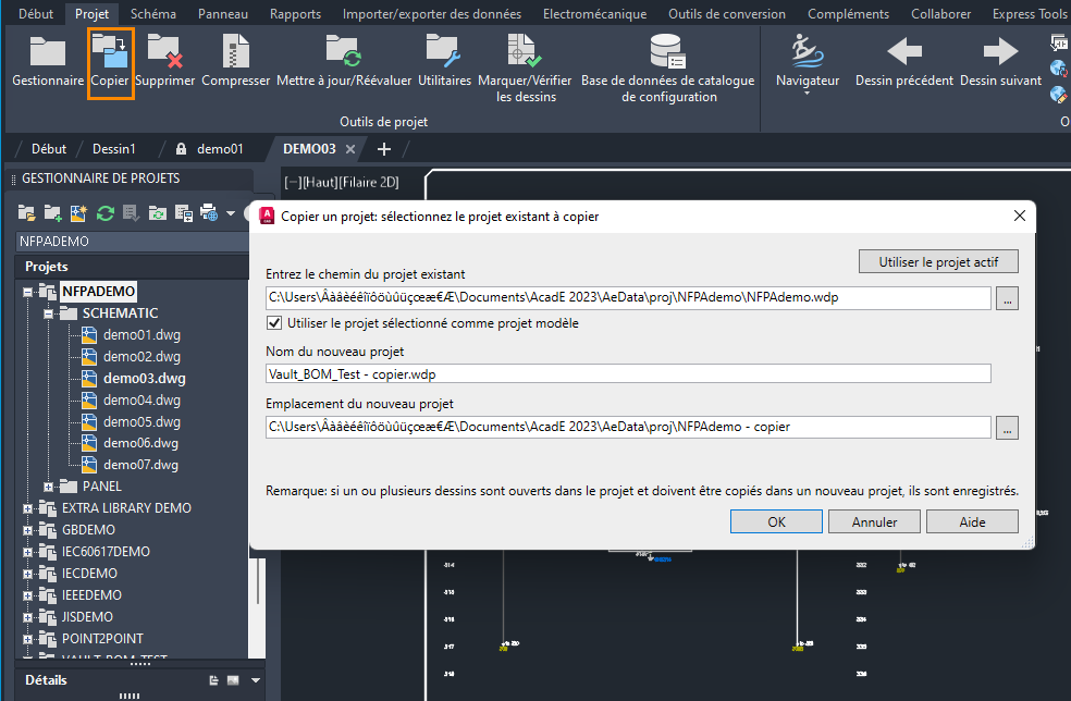 La copie d’un projet existant est désormais un processus en une seule étape. Cette amélioration permet d’augmenter votre productivité et votre efficacité par rapport aux versions précédentes du jeu d’outils AutoCAD Electrical.