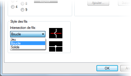 Lorsqu'un fil en croise un autre, il peut faire l'objet d'une boucle ou d'un jeu, tel que défini dans l'onglet Styles de la boîte de dialogue Propriétés du dessin.