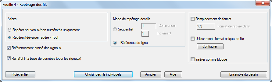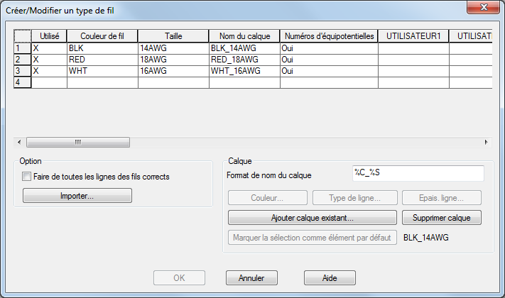 Pour créer un calque de fils, entrez une taille et une couleur de fil sur la ligne vide. Un nom de calque par défaut est indiqué, que vous pouvez renommer en fonction de vos besoins. Lors d'une opération de numérotation des fils, les numéros d'équipotentielles sont ajoutés à tous les calques, sauf s'ils sont définis sur l'option "Aucune numérotation de fil". Cette dernière s'avère utile dans certains cas, notamment pour les dessins unifilaires. Utilisez les options Couleur, Type de ligne et Epaisseur de ligne pour définir les propriétés du calque.